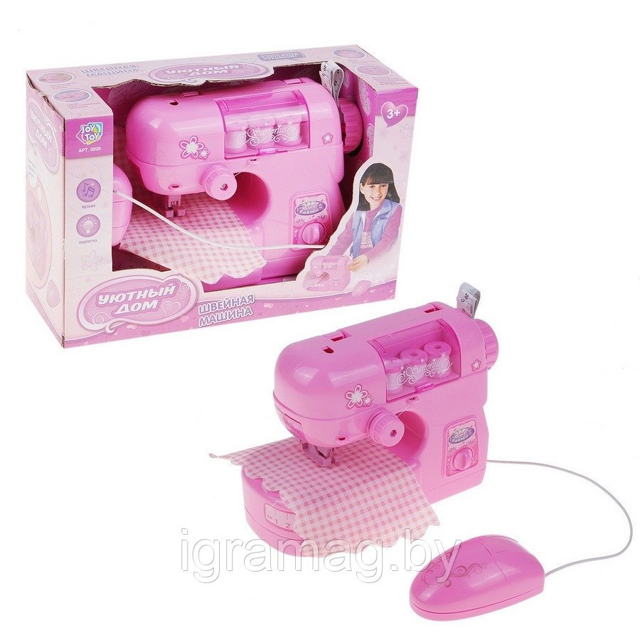 Функциональная игрушка для детей - швейная машинка. Оборудована ручной педалью, отсеком для хранения принадлежностей. К машинке прилагаются две катушки ниток и лоскут ткани. Можно прошивать ткань, нажимая на педаль. Игрушка работает от 2 батареек АА (в комплект не входят).